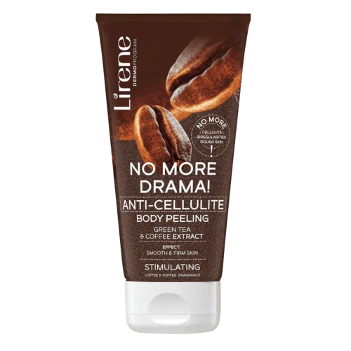 Lirene NO MORE DRAMA PEELING CORPORAL ANTICELULITIC – Spune STOP celulitei, imperfectiunilor si pielii uscate Efect: Piele neteda si ferma Ceai verde si extract de cafea Parfum stimulant de cafea si caramel PEELING CORPORAL ANTICELULITIC. Particulele de cafea ecologice conținute în peeling elimină intens celulele moarte ale pielii, elimină rugozitatea și îmbunătățesc fermitatea și suplețea pielii. Acestea oferă un efect de drenaj blând și ajută la eliminarea toxinelor din organism. Produs testat dermatologic.
